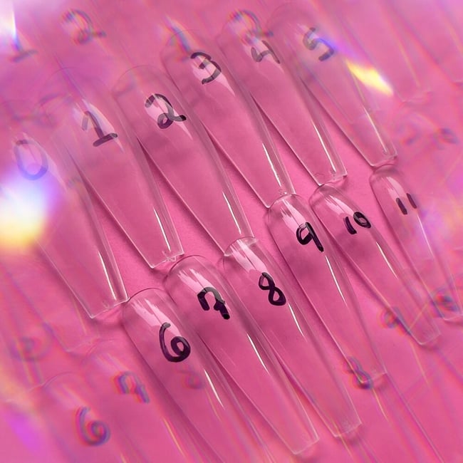 How to size: Place the tips (blank press ons) over your natural nails to find what size fits you best for each nail. Tips should rest comfortably over your natural nail, side wall to side wall.